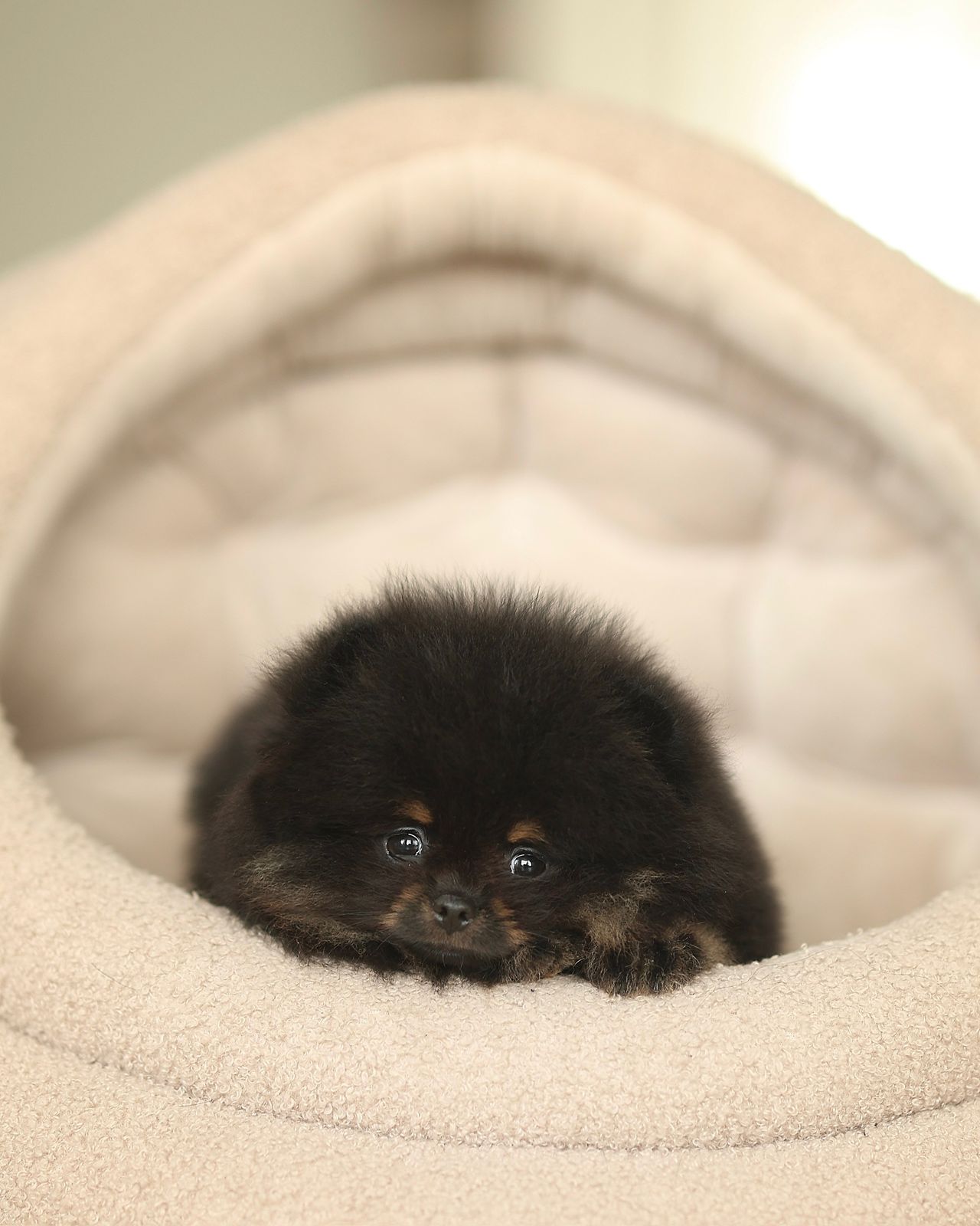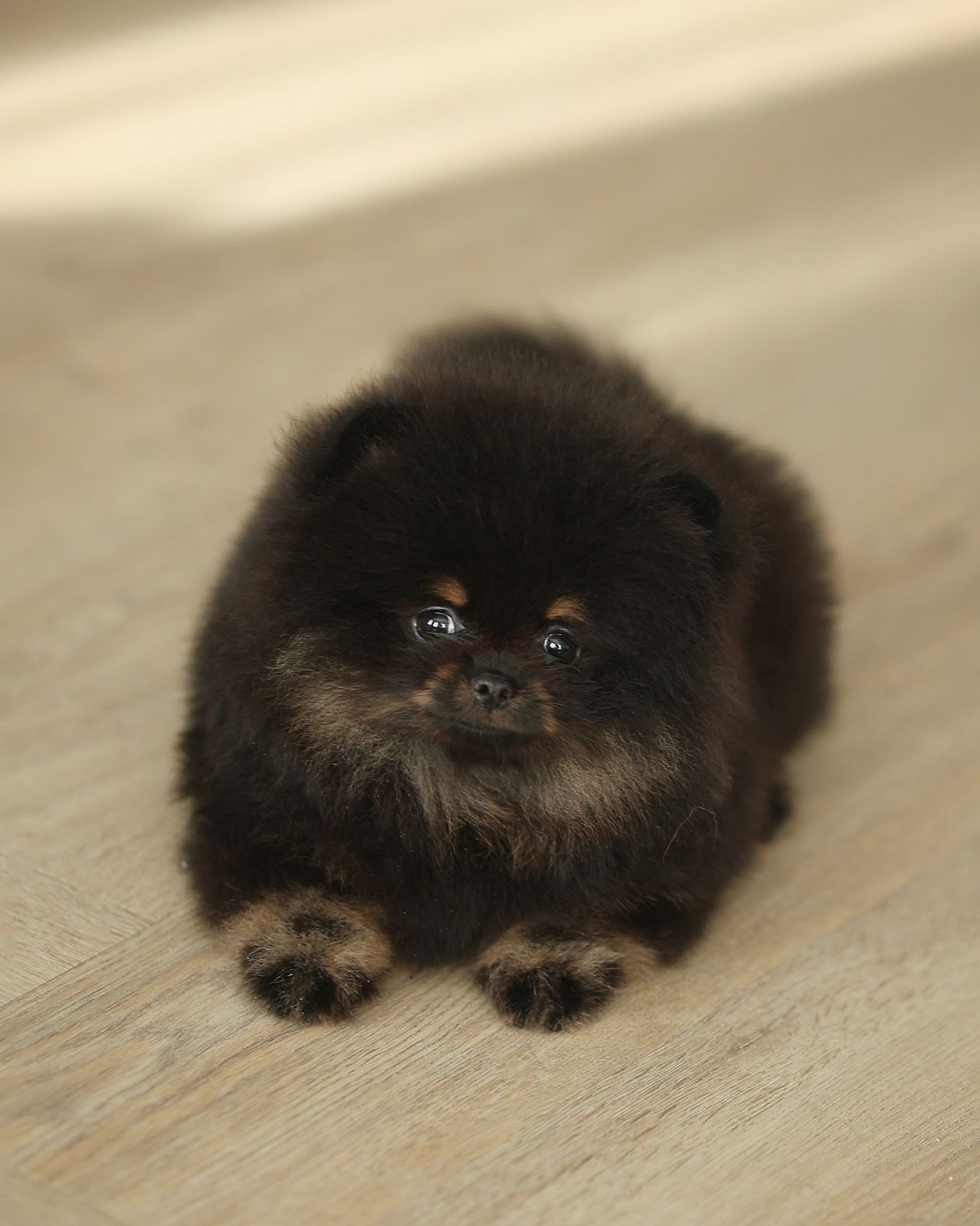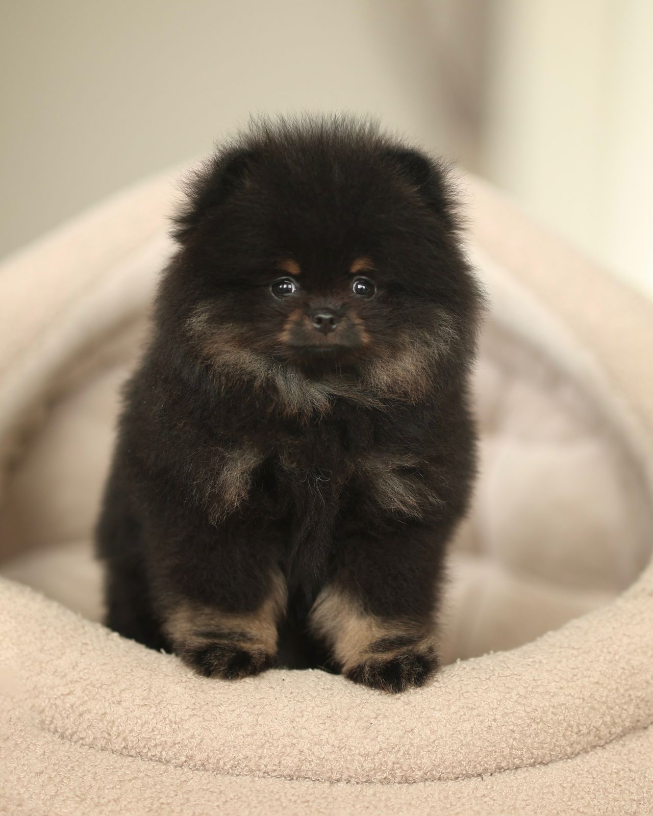 Meet Amber Noir, a tiny Pomeranian girl who looks like a perfectly polished piece of black velvet gently brushed with warm amber light. At just two and a half months old, she already knows how to sit still in a way that makes the world pause for a second. Not because she demands attention — but because she quietly owns it. Her coat is deep black, rich and fluffy, with glowing orange eyebrows, a warm amber chest, and soft orange-toned paws that look as if they were dipped in sunlight. This contrast gives her an expressive, almost cinematic face — thoughtful, curious, and slightly mischievous. Amber Noir is compact, plush, and beautifully balanced. She carries herself with calm confidence, observing before acting, choosing connection over chaos. She is not noisy, not dramatic, and not in a hurry. She prefers gentle contact, warm hands, and slow trust-building moments. This little girl has the kind of presence that feels comforting rather than overwhelming. She fits naturally into arms, into quiet evenings, into homes where beauty is appreciated in details — not in excess. Amber Noir would be ideal for someone who: values emotional connection over impulse decisions understands the delicacy of miniature breeds is ready to offer care, patience, and tenderness She is raised with attention, respect, and a focus on well-being. We believe that such puppies are not chosen randomly — they are recognized. Details are shared privately. Matching is selective and intentional.